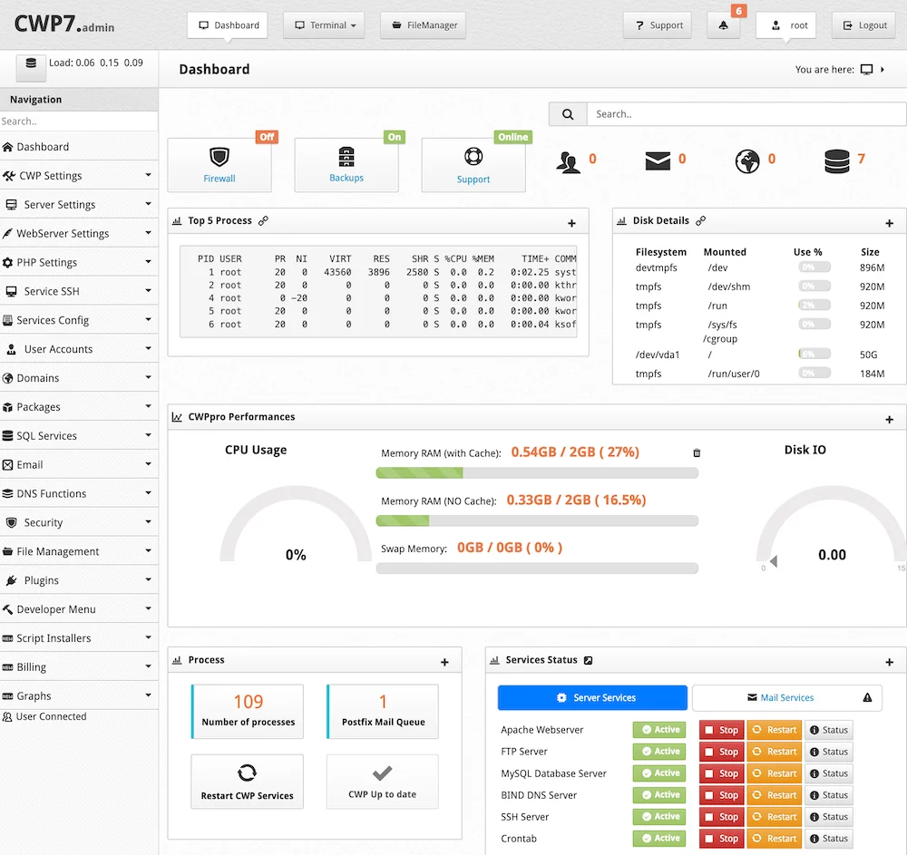 CWP, sunucu yönetimini kolaylaştırmak için arayüz sağlar. Bu arayüz üzerinden domain, e-posta, veritabanı yönetimi gibi işlemler gerçekleştirilebilir.